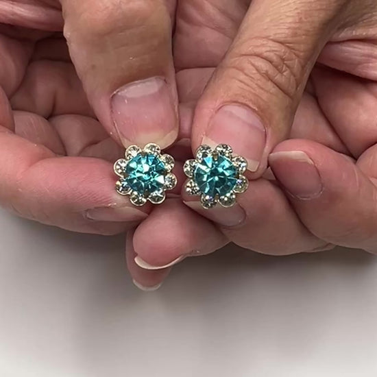 ● Construction/technique: Prong-set aqua center with halo rhinestones; converted from clip-ons to pierced with silver-tone posts and stabilizer push backs
