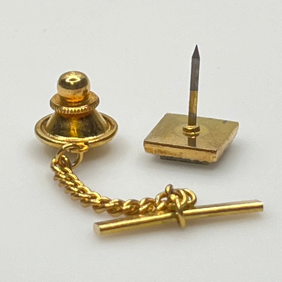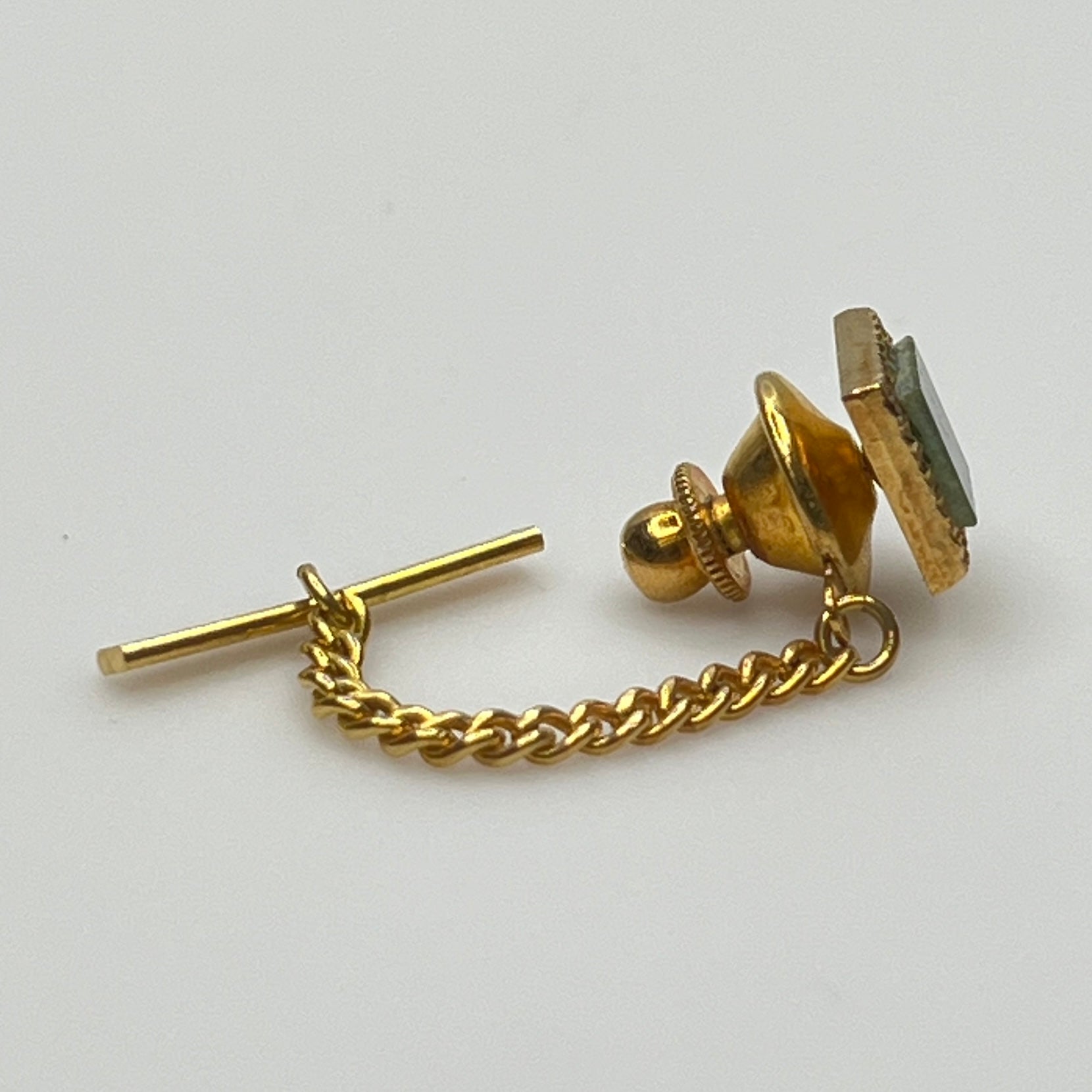 • Tie tack: Square-cut green jade in textured frame with chain and toggle