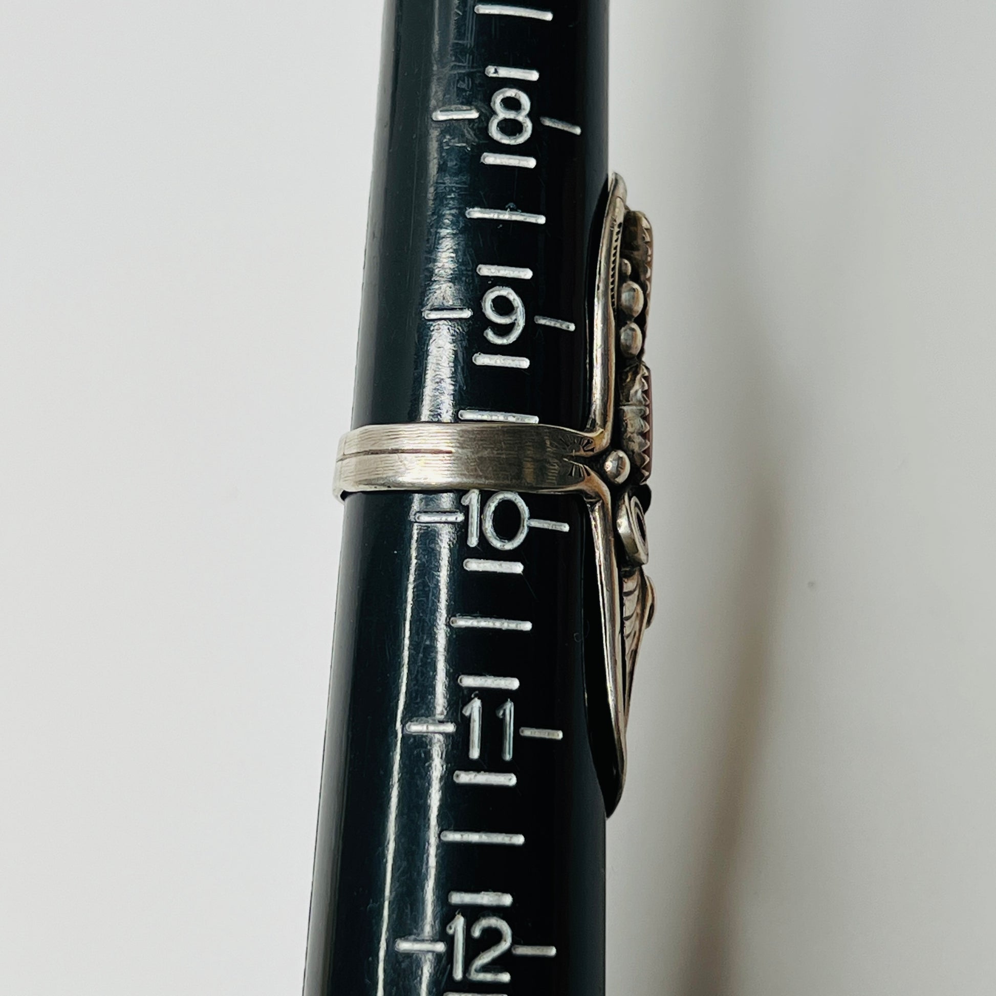 Radiating handcrafted artistry and soulful desert beauty, this vintage Native American ring makes an unforgettable statement. Set with glowing mother of pearl cabochons and rich silverwork detailing, the elongated silhouette spans the finger like a miniature tapestry—bohemian, bold, and beautifully storied.