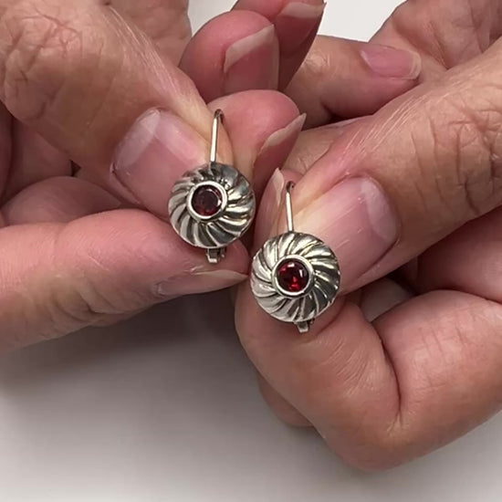 A fiery flash of vintage charm. These sterling silver earrings are a gleaming nod to mid century design, with their sculptural swirl faces and richly hued red spinel centers. The high-shine silver catches the light with every turn, while the saturated red gemstones add a mood of elegant drama — like a vintage cocktail ring, reimagined for the ears.