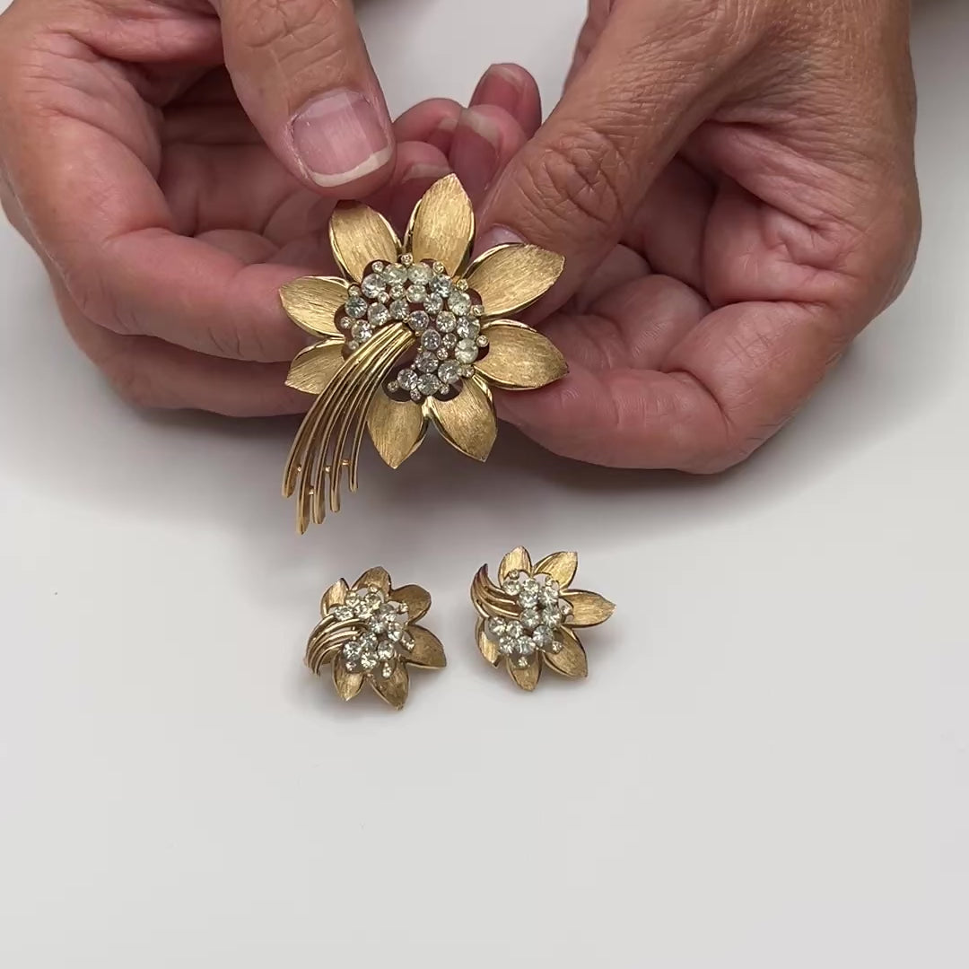 Trifari Rhinestone Flower Brooch & Earrings – 1950s Gold Starburst Set – Signed Vintage