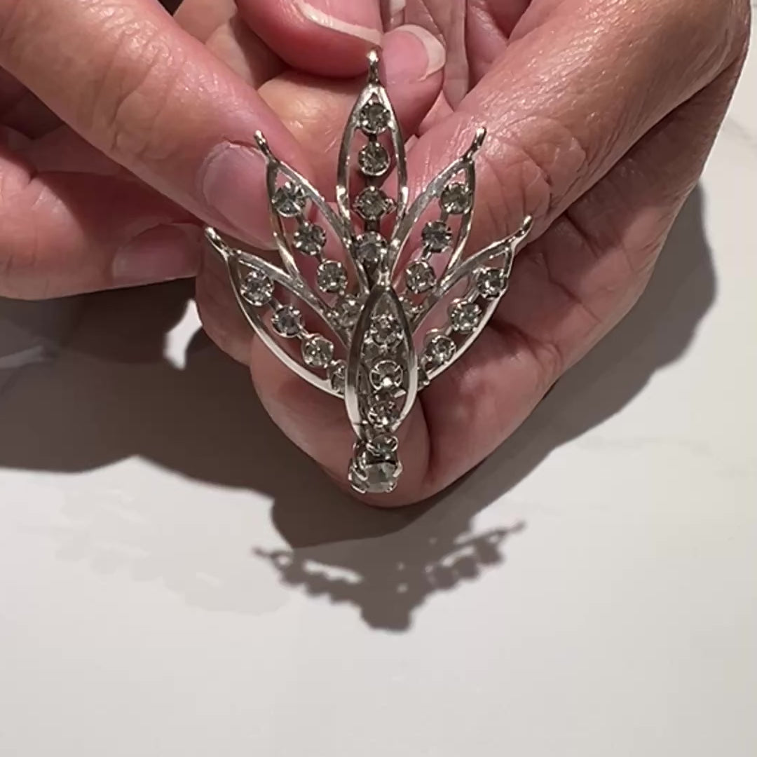 Graceful and luminous, this mid-century rhinestone brooch brings the elegance of nature into sparkling form. Shaped like a stylized leaf, its openwork silver-tone setting is lined with brilliant prong-set rhinestones that catch the light with every movement. A timeless design that blends botanical inspiration with classic glamour.